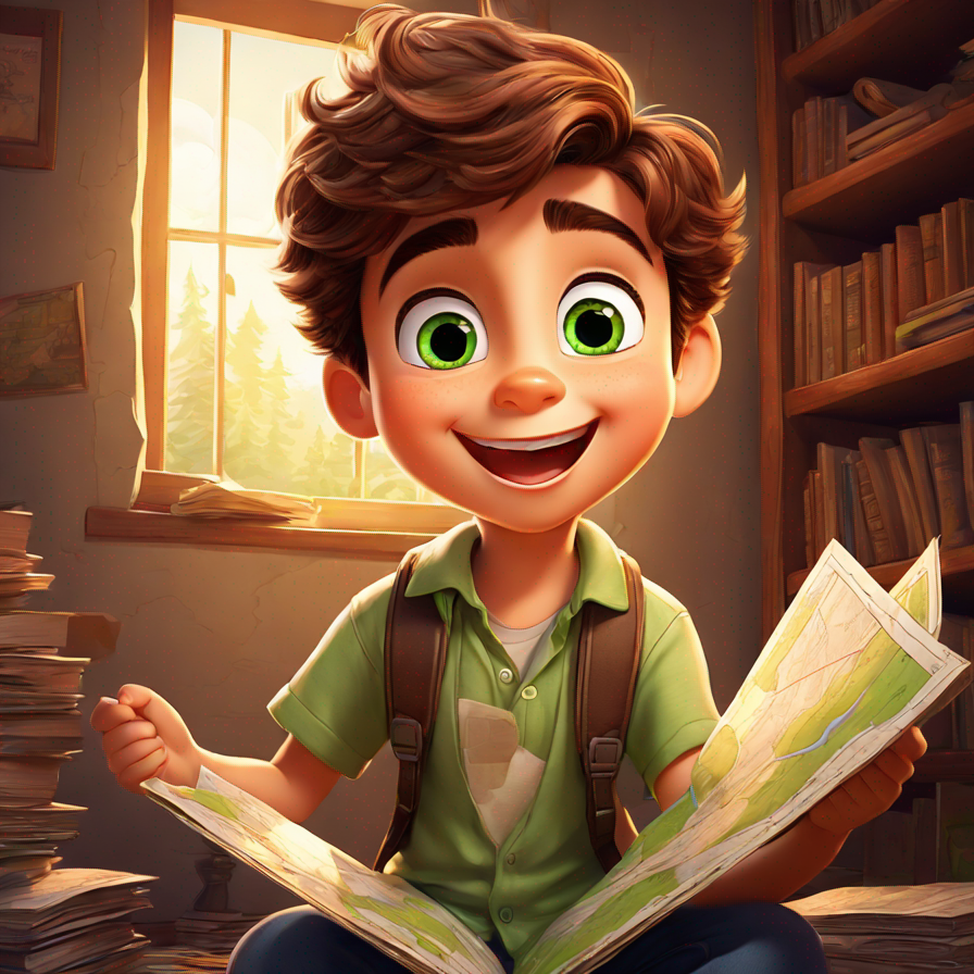 Once upon a time, in a small village, there lived a curious boy named Leo. Leo had bright green eyes and messy brown hair that always seemed to be filled with adventure. Leo loved exploring and learning new things, but his favorite pastime was reading books about far-off lands and magical creatures. One day, as Leo was wandering through the village, he stumbled upon an old, tattered map. The map depicted an enchanted forest filled with mysterious creatures and hidden treasures. Leo's eyes sparkled with excitement as he realized that this was an adventure he couldn't resist.